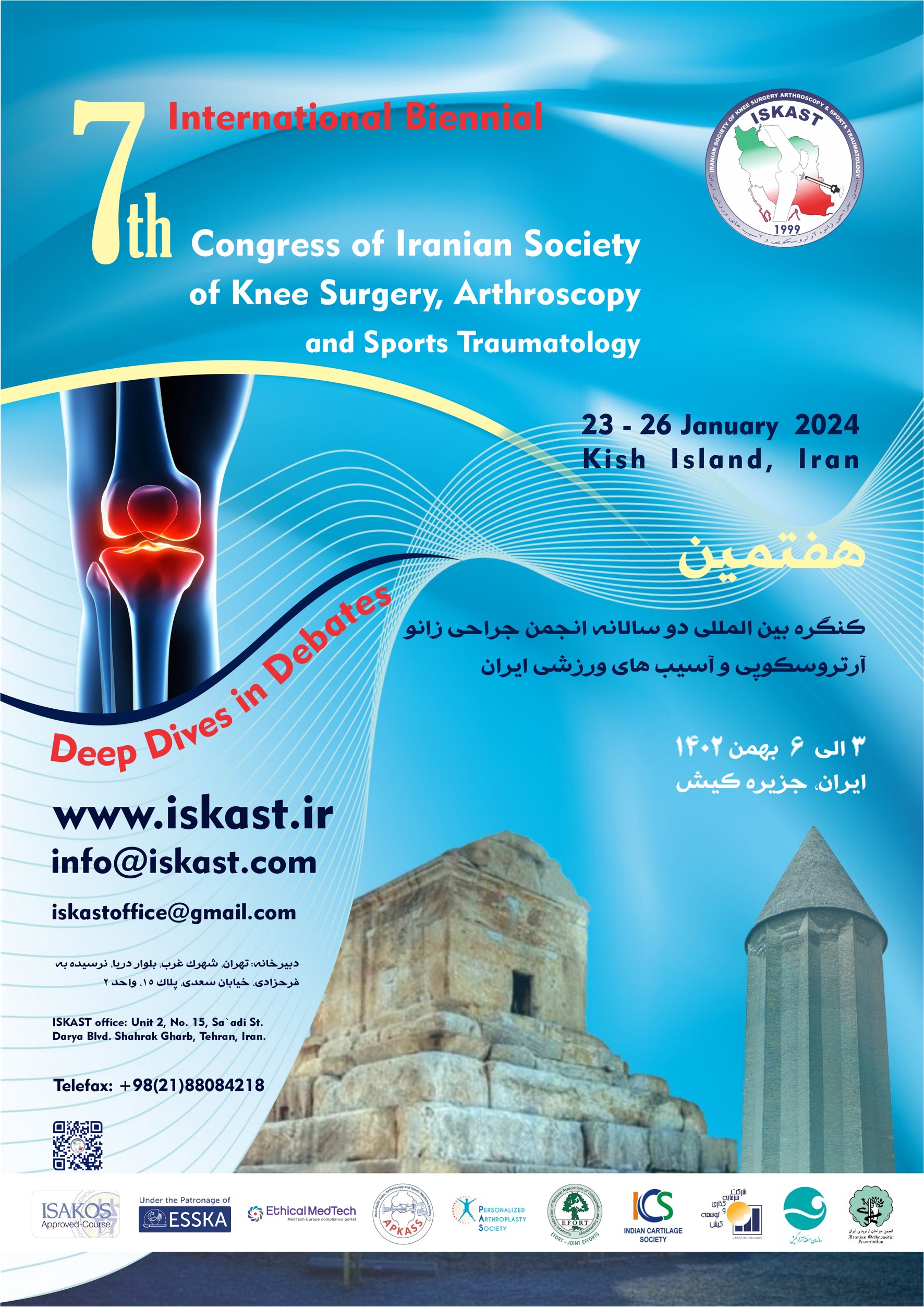 We are delighted to welcome you to the 7th International ISKAST Congress, which will be held on the beautiful Kish Island. The congress provides a great opportunity for sharing new knowledge and discussing recent advances in the field of knee surgery.